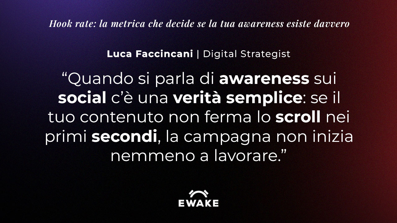 Nel mondo dell’awareness, invece, questi indicatori non esistono. Non puoi giudicare un contenuto dal CTR come unico termometro, e non puoi aspettarti indicatori di vendita immediati. È esattamente qui che l’hook rate fa la differenza. Diventa il primo e più efficace modo per capire se il contenuto sta facendo il suo mestiere: catturare attenzione e trasferire almeno un primo “strato” del messaggio.